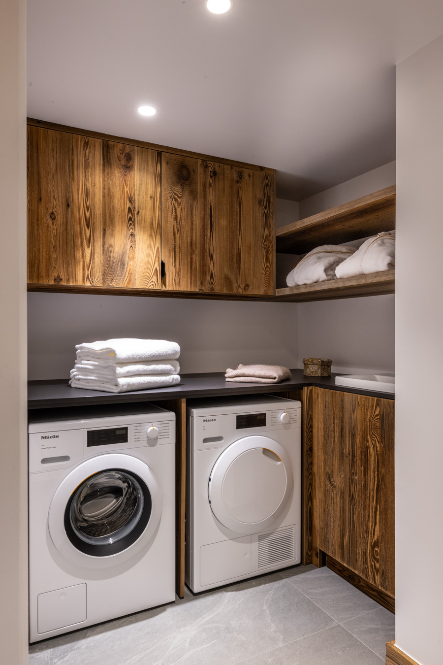 La Suite n°7 accueille jusqu’à 15 personnes, soit 14 adultes et 1 enfant. En plus des six chambres doubles et de la chambre dortoir enfants, elle offre au dernier niveau, une superbe pièce à vivre sur tout un étage, avec une impressionnante hauteur sous plafond. Le séjour s’articule autour d’une magnifique cheminée à bois centrale. Une grande cave à vins avec un bar, un espace repas et une cuisine toute équipée viennent compléter cette pièce. Cette Suite dispose également d'un lave-linge.