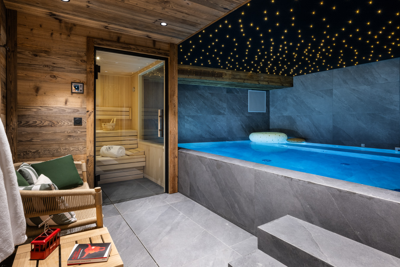 Pour un moment de détente dans la plus stricte intimité, vous pourrez profiter d’une vaste piscine intérieure chauffée, d'un sauna ainsi que d’un bain à remous sur la grande terrasse.